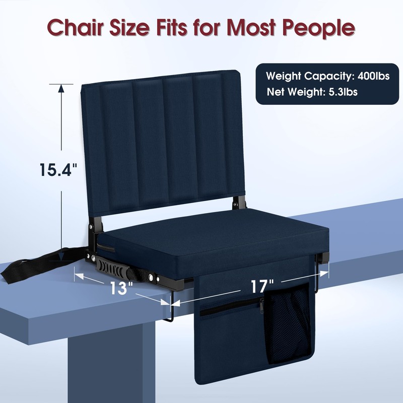 If you're in search of the perfect companion for watching a football game, look no further! Our stadium seating for bleachers is your best choice. It offers ultimate comfort and versatility, elevating your game-watching experience to a whole new level.Firstly, our wide stadium seats for bleachers with back support feature a comfortable backrest and a cozy seat base. You can enjoy the game continuously without feeling tired.Secondly, safety is our top priority. Two reinforced steel hooks ensure the stadium cushion seat remains stable and reliable during use, allowing you to change your sitting position with confidence and fully enjoy the game.And there's more - this stadium seats with back support are constructed with a metal frame, high-quality Oxford fabric, and thickened anti-slip rubber strips, ensuring durability and stability, giving you peace of mind for extended use.Furthermore, this bleacher chairs with back and cushion are space-saving. After the game, you can easily fold the seat, take home or store it in your car, making it incredibly convenient.So, hesitate no more! This all-around stadium seat is eager to be your loyal companion, offering endless joy while watching the game. Purchase now and make your football game-watching experience even more perfect!