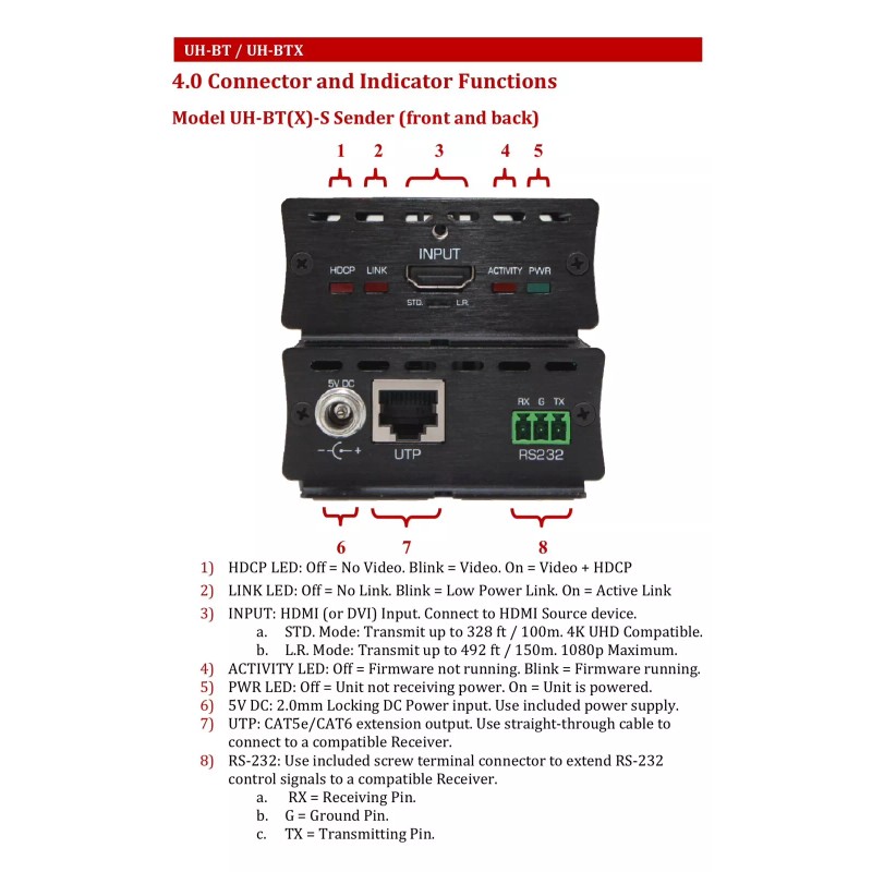 The UH-BT and UH-BTX are a family of HDBaseT™ compliant Senders and Receivers used to extend uncompressed HDMI video and RS-232 control signals up to 230 ft (-BT models) or 328 ft (-BTX models) over a single CAT5e/CAT6 UTP cable.