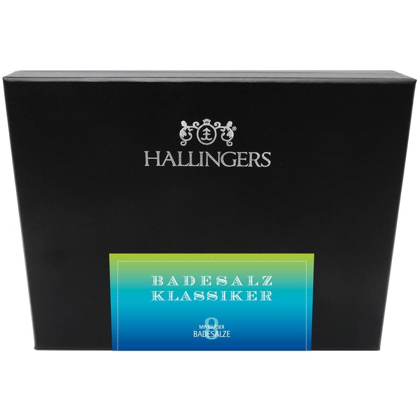 Hallingers Badesalz Klassiker - Blue - 8 Sorten Badesalz Geschenk-Set mit Totes Meer-Salzen, 8 Badesalze Set in Schraubläsern und Box (Set) - Ostergeschenke Osterkörbchen Ostereier & als Osterdeko | G