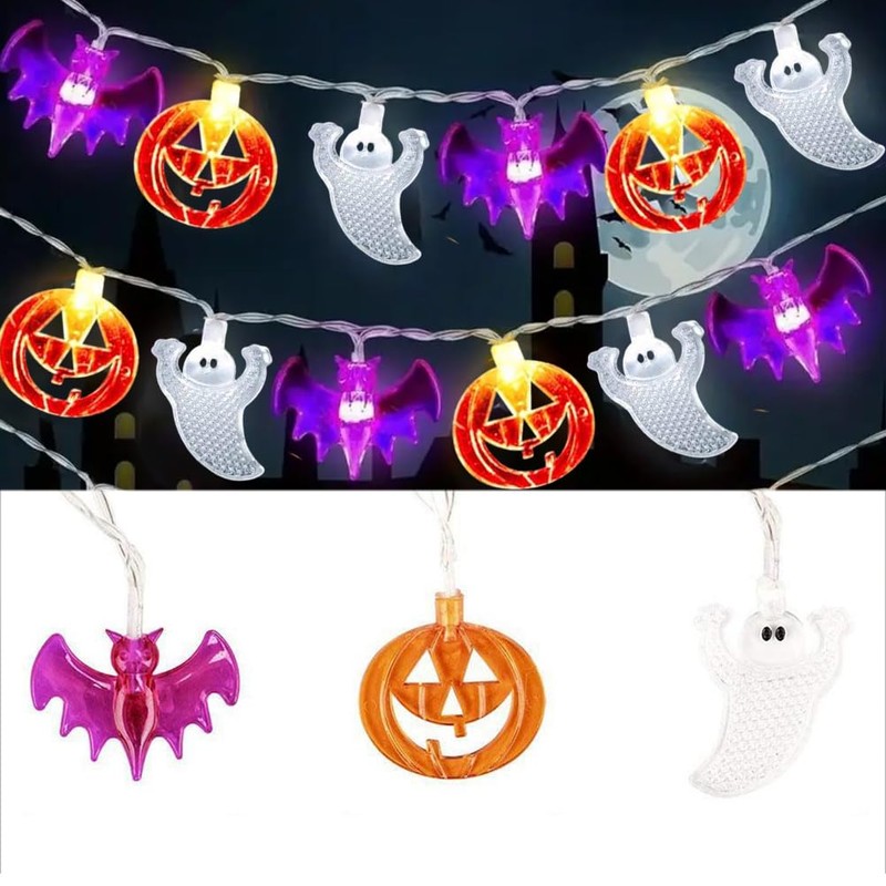 - Halloween Kürbis Lichterkette: 3er Pack Halloween Lichterkette mit verschiedenen Themen, orange Kürbis, lila Fledermaus, weißer Geist, einfach eine mysteriöse gruselige Atmosphäre aufzubauen.