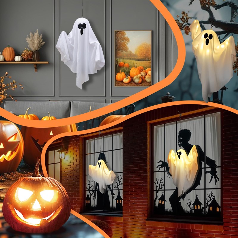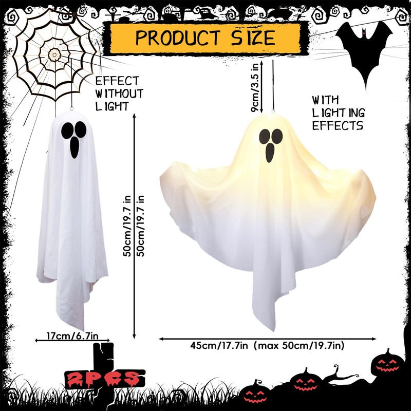 - 👻Realistic Halloween Decorations: Trick or treat! You'll get a set of 2 Halloween light-up hanging ghosts. Transform your yard, porch, or living room into a spooky yet charming Halloween spectacle with these realistic hanging ghost. Enveloped in flowing white fabric, these floating light up ghosts emit a soft, shimmering glow, creating an eerie yet endearing ambiance