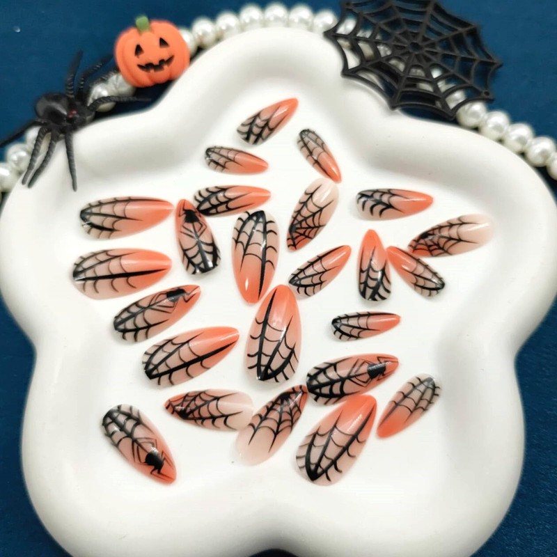 Halloween Nails Press ons Almond Press on Nails Medium Fake Nails with Spider Spider Web Designs Ombre Acrylic Glossy Glue on Nails Orange Gradient Full Cover Artificial Stick on Nails for Women 24Pcs