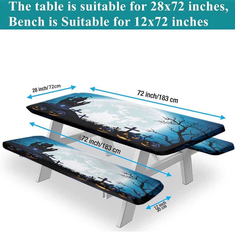 - FITTED TABLECLOTH FOR SECURE FIT- Our Halloween Picnic Table & Bench Tablecloths were designed to stay on the table even under windy weather, so that nothing keeps you back from enjoying your outdoors dining. Set includes: 1 Table cover (for 72" X 28" picnic tables) and 2 Bench Seat Covers (for 72" X 12" benches).