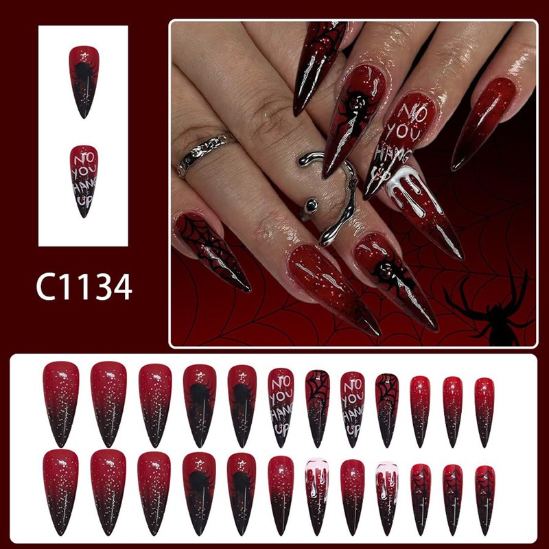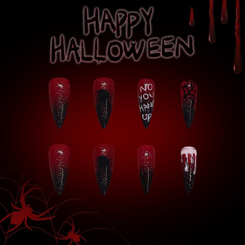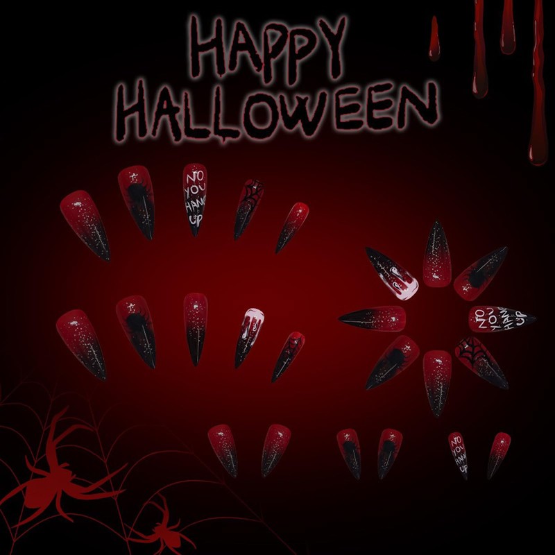 Halloween Press on Nails Long Almond Fake Nails Red Black Gradient Stick on Nails Glossy Shiny The Day of Dead False Nails Full Cover Artificial Acrylic Nails Reusable Nails Kit for Women Girls 24Pcs