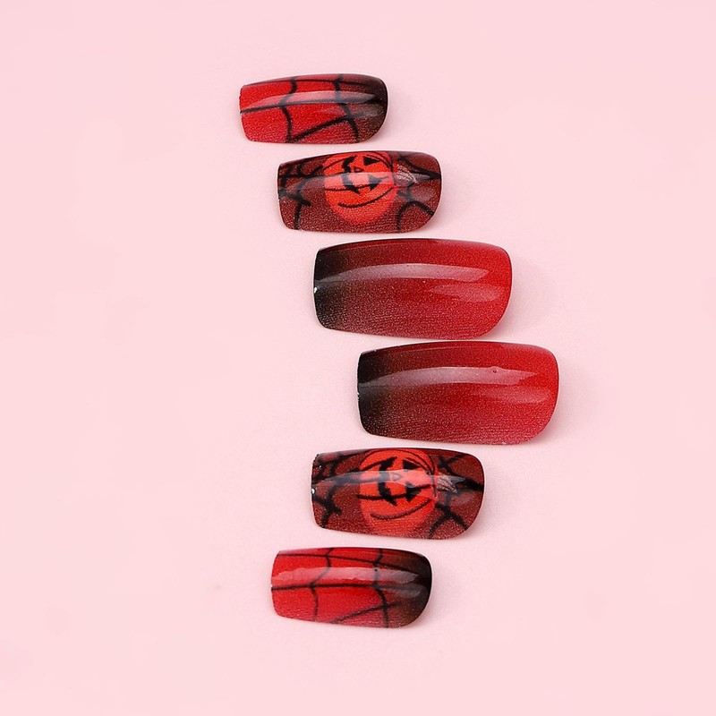 - 【Package Include】24 Halloween-themed red glitter square acrylic false nails with pumpkin and spider web patterns, 1 sheet of 24 jelly glues, 1 nail file, 1 wooden stick, and 1 alcohol pad. All you need for a festive manicure