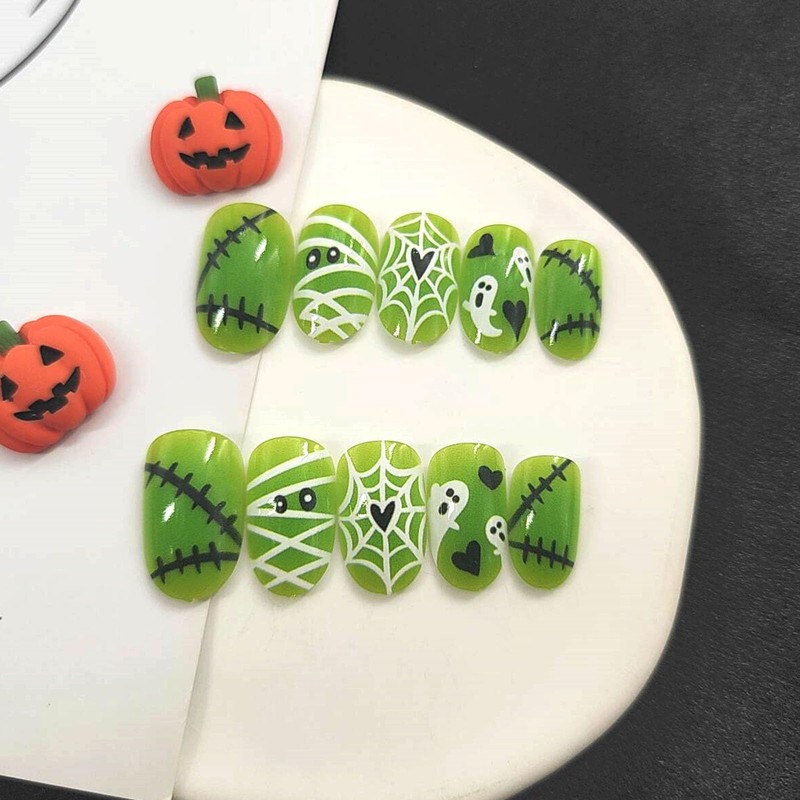 Halloween Press on Nails Short Oval Fake Nails with Ghost Spider Web Heart Lines Designs Glossy Glue on Nails Press ons Green Full Cover Artificial Stick on Nails for Women 24Pcs