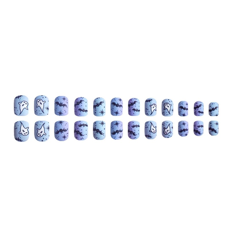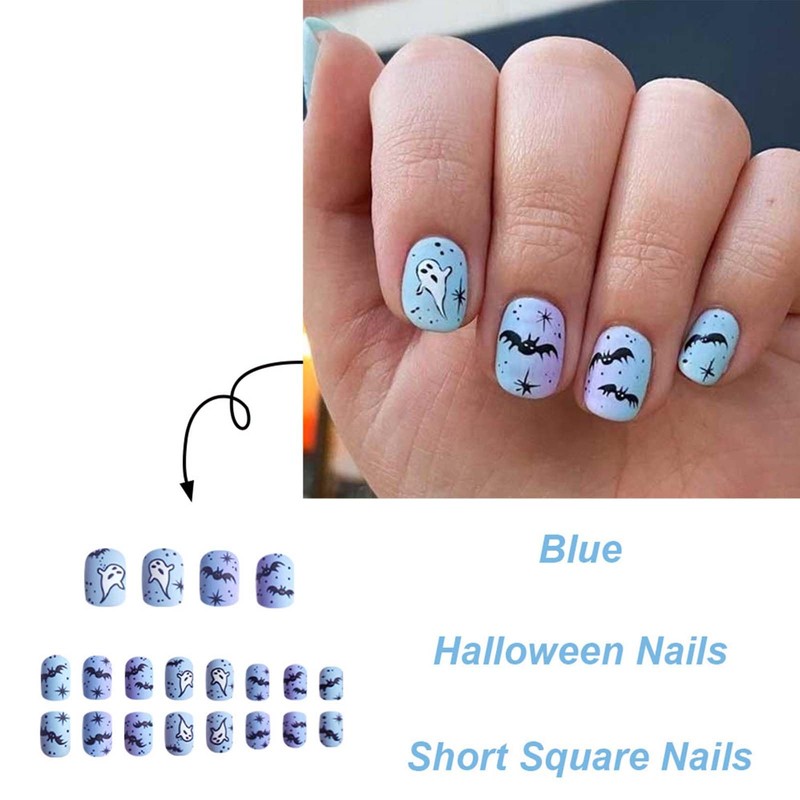 Halloween Press on Nails Short Square Fake Nails Ghost Bat with Gradient Design Blue False Nails Acrylic Artificial Glue on Nail Full Cover Stick on Nail for Women Manicure Decoration 24Pcs