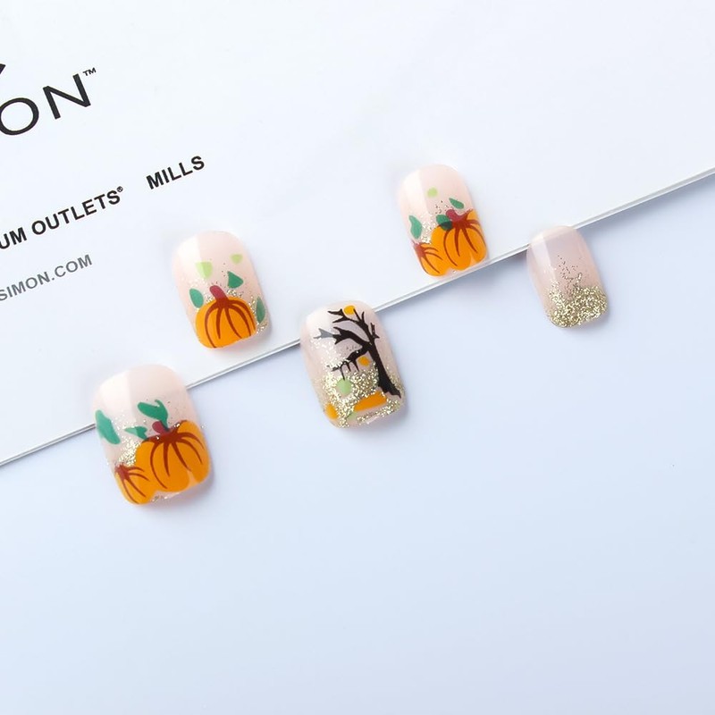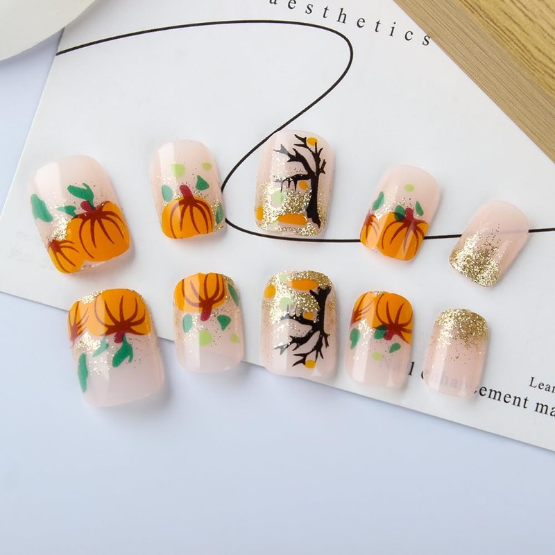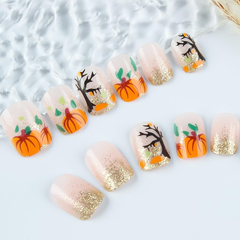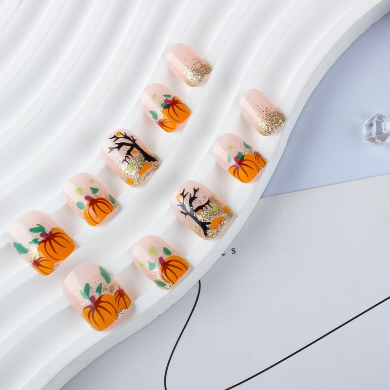 Halloween Press on Nails Short Square Fake Nails with Tree Pumpkin Glitter Designs Orange Nails Press ons Glossy Nude Halloween Acrylic Thanksgiving Stick on Nails for Women 24Pcs