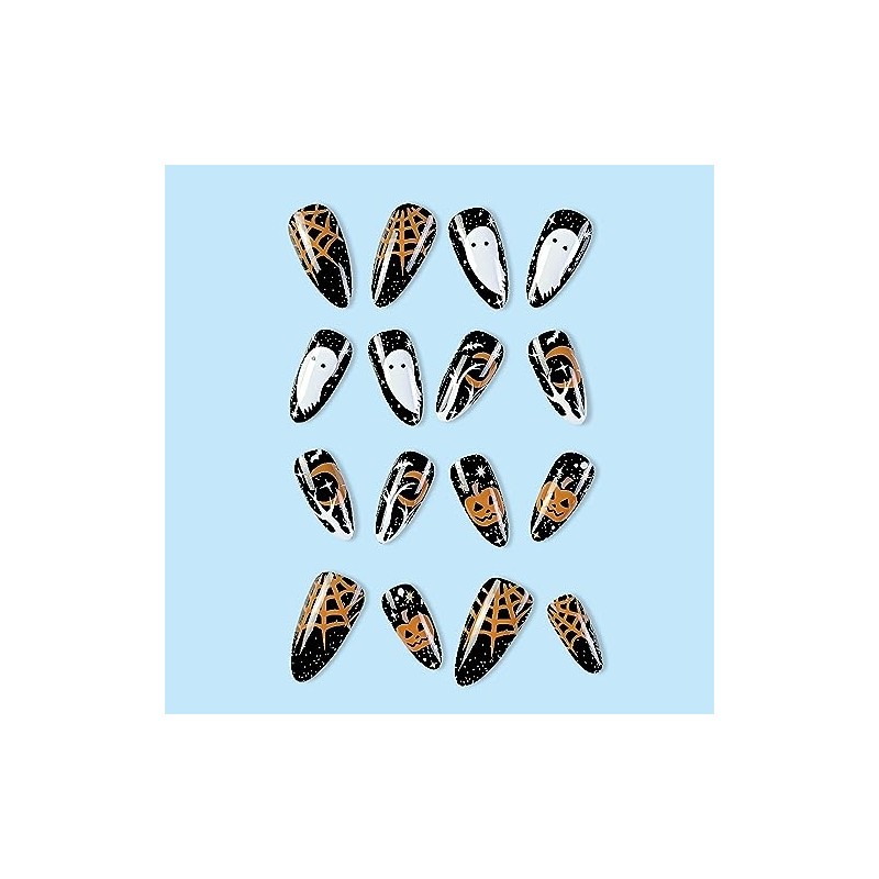 Halloween Press on Stiletto Fake Nails - Black Full Cover Ghost Pumpkin Spider Web False Nails with Moon Stars Glossy Designs - 24 Pcs