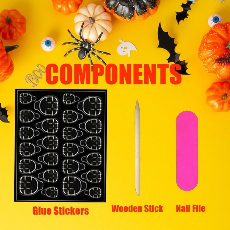 - Package Contains:24Pcs short press on toenails +1 nail file + 24pcs jelly glue stickers+1 wooden stick. Durability of jelly glue is not as good as liquid glue, but it makes halloween fake toenails reusable
