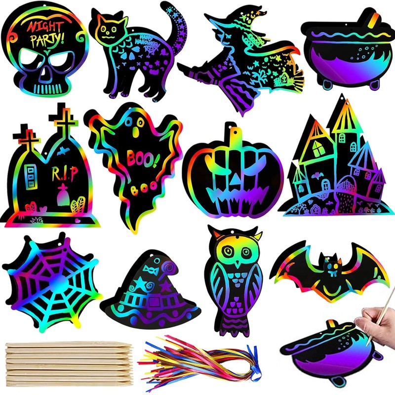- Creative crafts: Our Halloween scratch paper set contains 12 different Halloween elements, such as pumpkins, skulls, witches, cats, etc. All Saints' Day decorations come in different shapes. Can increase the festive atmosphere and improve children's craftsmanship and imagination. Create amazing creative artwork.