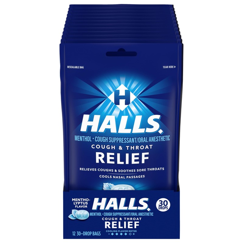 - Twelve packs with 30 drops each, 360 drops total, of HALLS Mentho-Lyptus Cough Drops