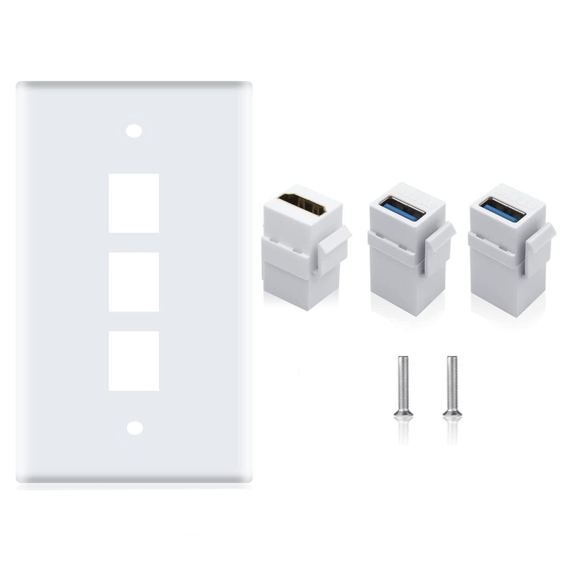 Halokny HDMI USB 3.0 Wall Plate - 3 Port Outlet With 1 HDMI Keystone Jack + 2 USB 3.0 Ports for Face Plate, White