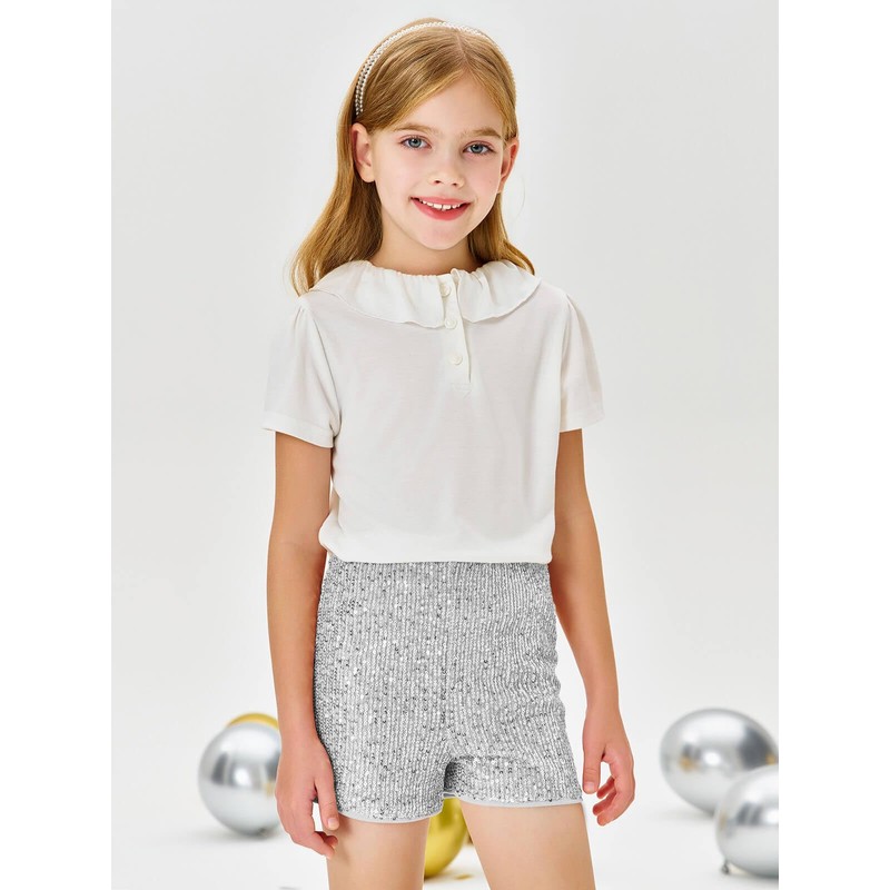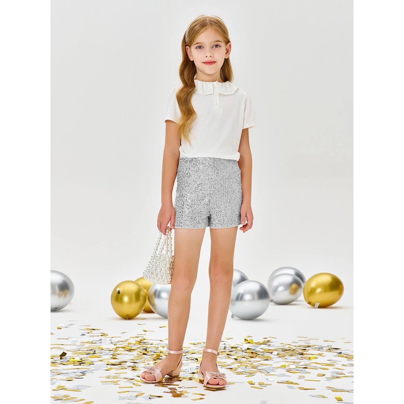 Haloumoning Girls High Waist Sequin Shorts Elastic Straight Leg Sparkly Glitter Party Shorts 5-14 Years Silver
