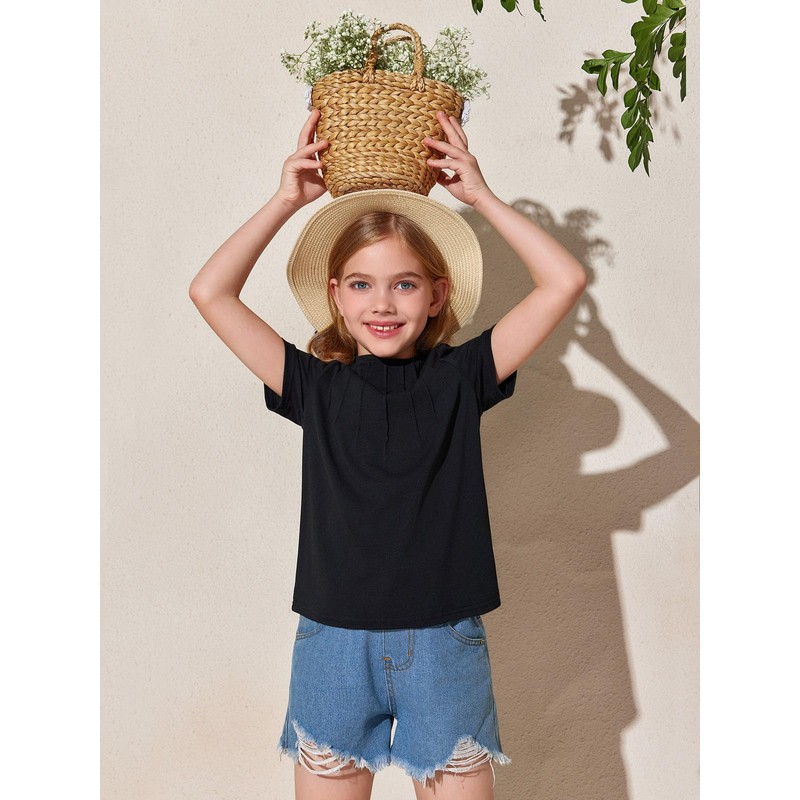 Haloumoning Girls Pleated T Shirts Kids Summer Short Sleeve Fashion Tops Tees 5-14 Years Black