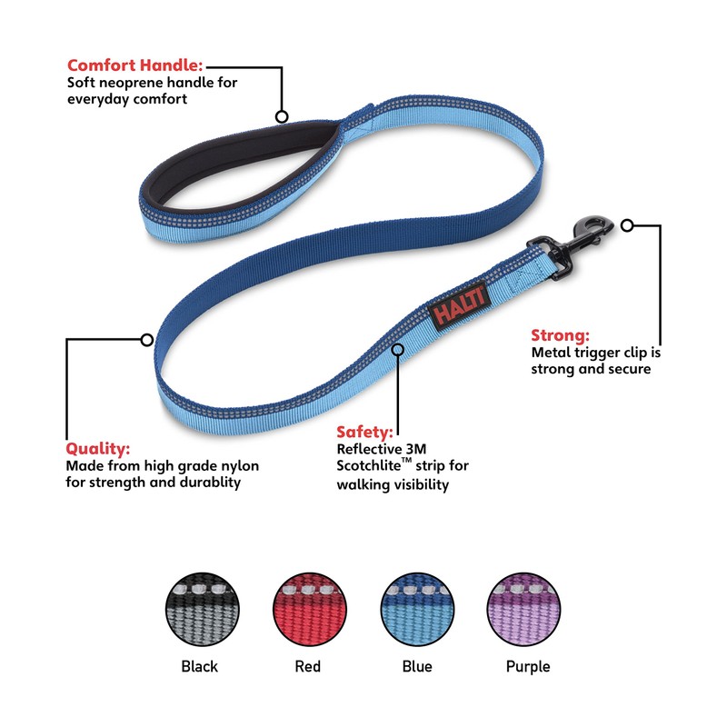 - COLOUR-COORDINATED - Black, blue, purple, and red lead options. Colourful two-tone design, made from premium grade nylon webbing. Matching Halti dog collar, dog harnesses and multi-functional leads also available.