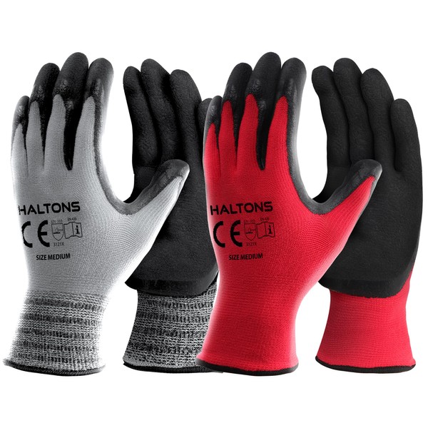 Haltons Latex & Polyester Work Gloves Men (12 Pack Medium), Durable Gardening Gloves for Women, Snug Fit & Non Slip, Ideal for DIY, Builder & Mechanic Work (Red/Grey)
