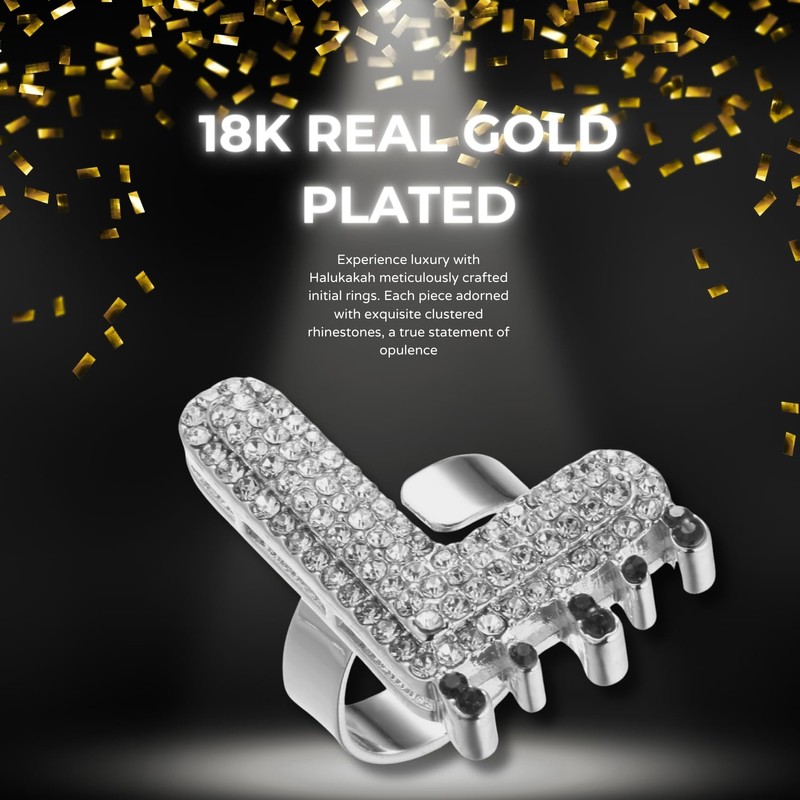 Halukakah 18K Real Gold/Platinum White Gold Plated Initial Bubble Letter Ring for Men and Women - Adjustable Size - Clustered Rhinestone Letter Water Drop - for Your Loved Ones, Brass, No Gemstone
