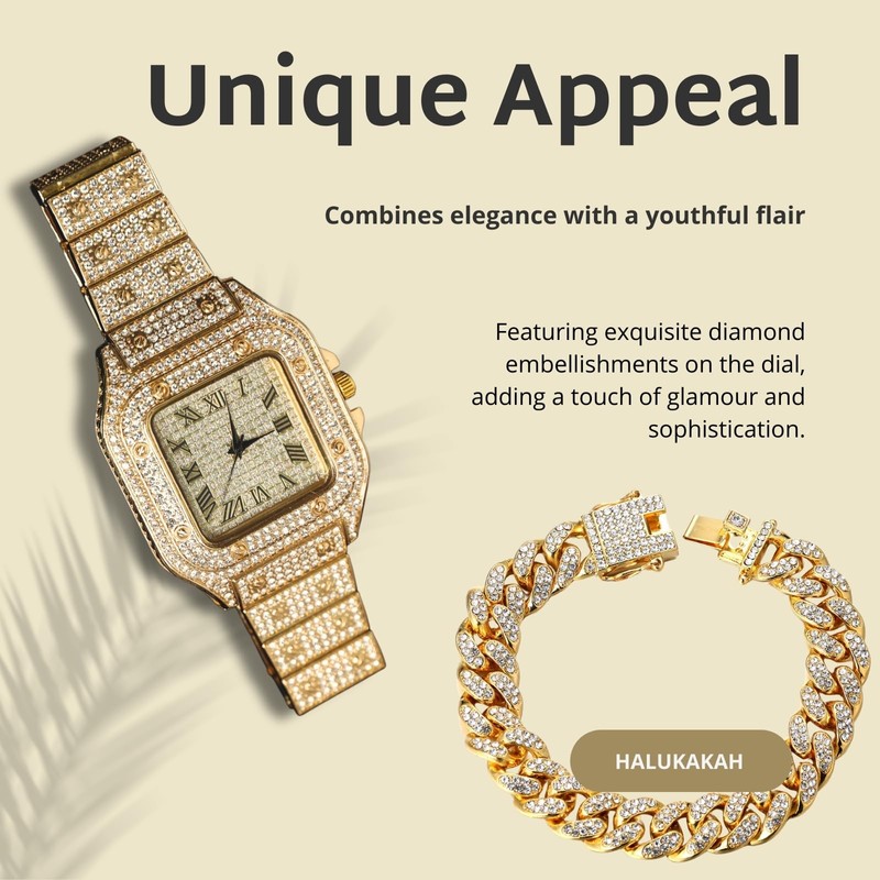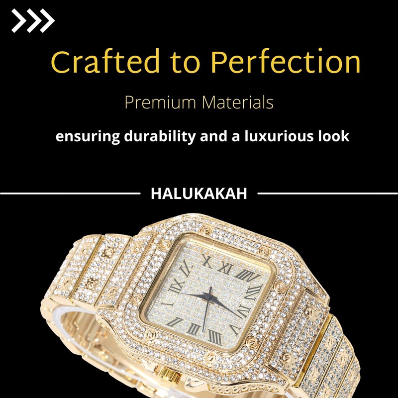 Halukakah Diamond Gold Watch Iced Out for Boys - 18K Real Gold/Platinum Plated, 40 mm Square Dial, Japanese Quartz Movement - 20 cm Length - Optional with Cuban Link Chain, with Adjustment Tool, 18K