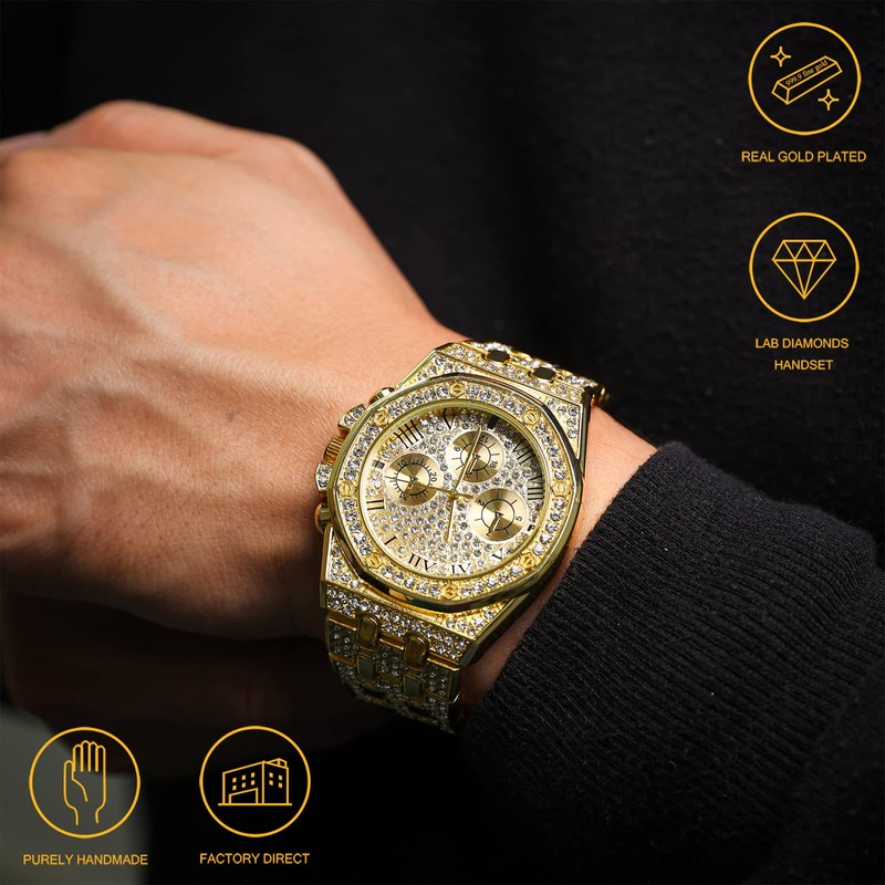- √ 3 STANDARDS FOR A GOOD DIAMOND WATCH - Thick Gold(4 Times+ Real Gold Plated),Pro Handset Diamonds (Handcrafted by 15 years+ experience artisans instead of machine glueset),Reasonable Price(Only pay for the product itself).