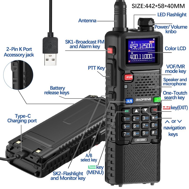 - Professional Ham Radio:The receiving frequency range:108MHZ-136MHZ,136MHZ-174MHZ,220MHZ-260MHZ,350MHZ-390MHZ,400MHZ-520MHZ,the transmitting frequency range:144MHZ-148MHZ,420MHZ-450MHZ. ,Up to 999 storage channels and a 1.77 inch large color screen, making operation more convenient.The enlarged walkie talkie body size is designed ergonomically to enhance user feel.Support Chirp.FCC ID:2AJGM-5RM