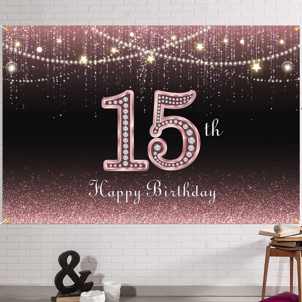 HAMIGAR 6x4ft Happy 15th Birthday Banner Backdrop - 15 Years Old Birthday Decorations Party Supplies for Women - Rose Gold