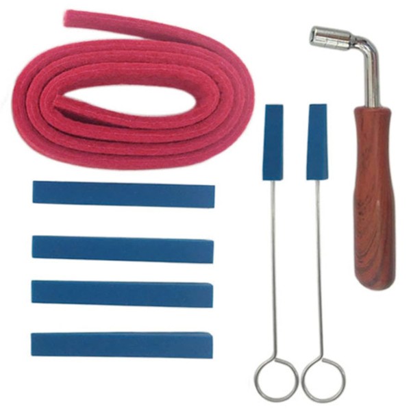 - 8-piece tool set essential for piano tuning: An 8-piece set of essential tools for piano tuning. This set includes a tuning hammer, short mute with handle, mute, and sound quality strip