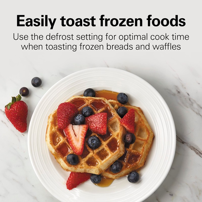 - GIVE FROZEN FOODS EXTRA TIME TO COOK: Use the defrost setting for optimal cook time and flavor when toasting frozen breads and waffles. Just press one button to defrosts and toast.