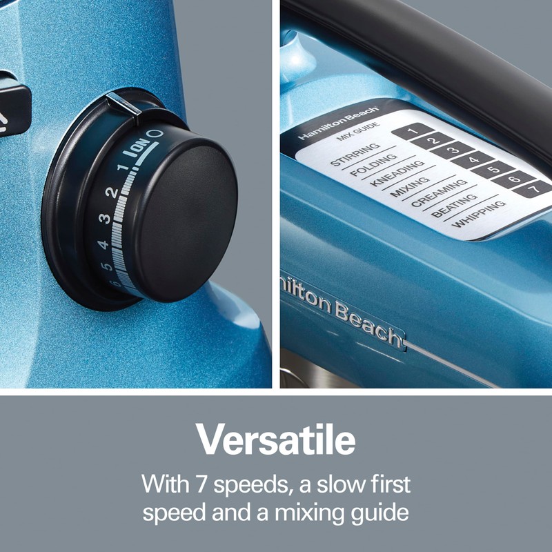 - VERSATILE 7 SPEEDS, SLOW FIRST SPEED & MIXING GUIDE: A helpful guide on top of the electric mixer helps you choose the right speed for the job. The slow first speed is great for kneading bread and reducing splatter when adding dry ingredients to wet ingredients.