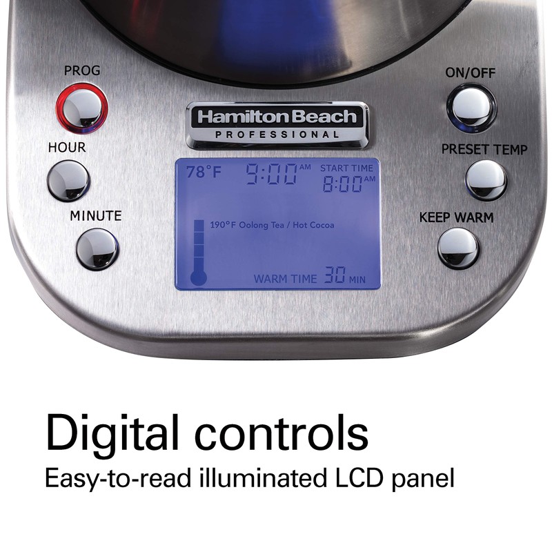 The Hamilton Beach 1. 7 liter professional digital LCD variable temperature control electric kettle, water boiler & tea heater with auto-shutoff & boil-dry protection boils water ultra-fast for tea, pour-over Coffee, hot chocolate, soups and more. Digital controls, 6 pre-programmed settings, an LCD readout and programmable time offer maximum control.