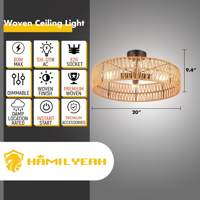 Hamilyeah 20 inch Semi Flush Mount Ceiling Light Fixture Woven, Boho Light Fixture Ceiling Mount, Rattan Ceiling Light Fixture Farmhouse 4 Light for Living Room, Bedroom, Foyer, Kitchen
