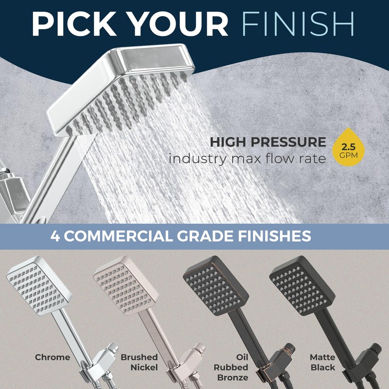 - Square design, maximum coverage – Our square shower head with handheld delivers a powerful stream across a wider surface for a high pressure, full-body showering experience.