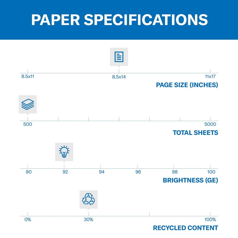 HAMMERMILL PRINTER PAPER - Hammermill Great White 8.5” x 14” printer and copying paper works as hard as you do. This dependable, everyday copy paper runs efficiently through all equipment and has a distinct contrast for easy readability. | 30% RECYCLED PAPER - Hammermill Great White recycled printer paper is made from post-consumer fiber. It is versatile paper with precise, accurate sheeting, consistent moisture content and curl control to ensure smooth, trouble-free performance. | 99.99% JAM-FREE GUARANTEE - We guarantee that you will not experience more than one jam in 10,000 sheets of recycled paper on high-speed digital equipment or we’ll replace your Hammermill paper purchase. You can trust Hammermill quality, guaranteed. | SUSTAINABLY MADE IN THE USA - Hammermill copy paper is Sustainable Forestry Initiative (SFI) certified. 100% made in the USA, it helps support 2.4 million sustainable forestry jobs in America, including family tree farmers. | VERSATILE - Available in a variety of sizes, this recycled 20lb copier paper is ideal for forms, bulletins, faxes, legal briefs, memos, price sheets, copies and more.