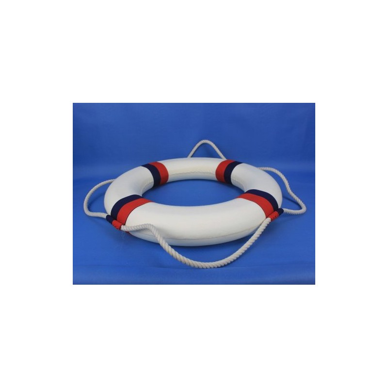 - Prominent white rope and red and blue bands contrast the white finish of the life preserver decoration