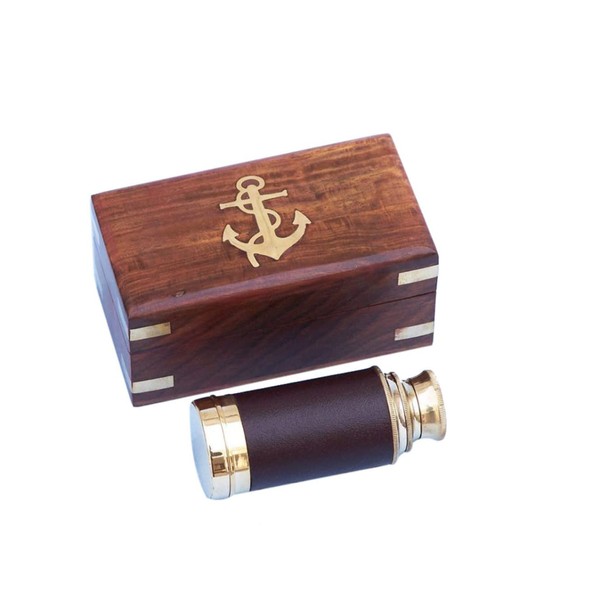 Hampton Nautical Scout's Chrome/Leather Spyglass Telescope with Black Rosewood Box, 7", Chrome