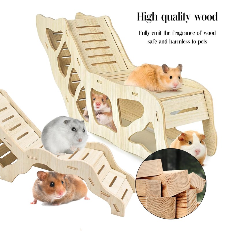 • Hand-made and Pet-friendly material: Hand-made by selected birch plywood & beech sticks without nails, the whole structure is sturdy and there have no gaps on climb ladders of the roof. Each corner of this hamster house are sanded smooth, brings you a durable & chewable hamster house & toy, helps to relieve their chewing desire & protect the pet’s teeth.