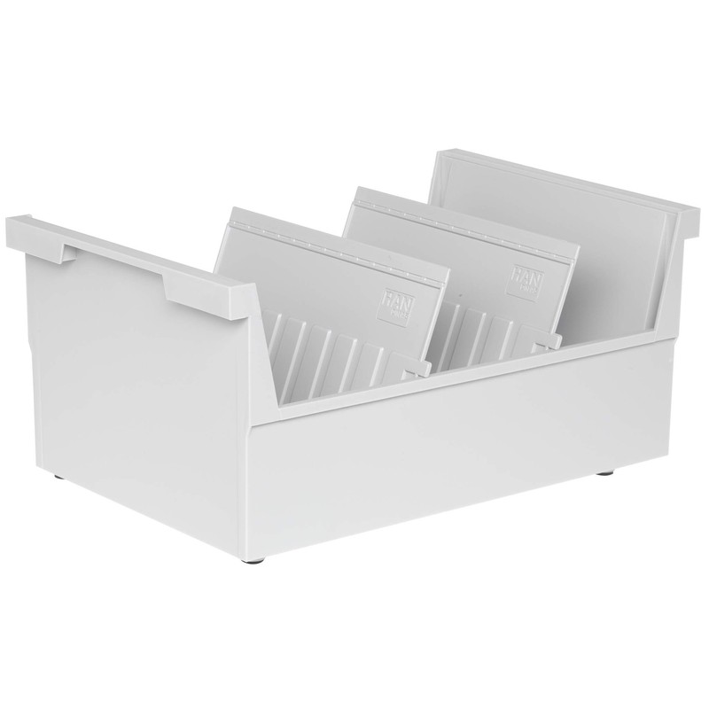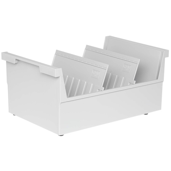 - Box contents: 1 x HAN 855-0-11, hanging tray DIN A5 landscape, for 1,000 cards, with 2 support plates (item no. 9025) and display tabs (item no. 9001). Original HAN branded product, protected by design. External dimensions (WxDxH): 226x350x156 mm. Colour: light grey