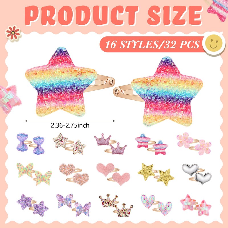 - Rich Amount and Style: you will receive 32 pcs hair clips for girls in 16 different styles, which can meet the needs of daily use and can be shared with others; Girls can mix and match these clips to personalize their looks, fostering imaginative play and encouraging fashion exploration while developing their style preferences
