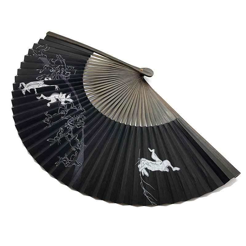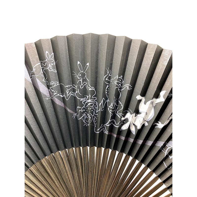 Hanakanzashi Men's Folding Fan, Choju-Giga, Paper Fan, Fan Bag Included, Fan Set, 8.7 inches (22 cm), Japanese Pattern, Silk Print, For Gentlemen, Large, Frog, Rabbit Black (121 Black), Black