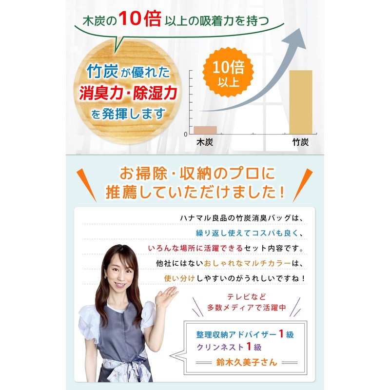 - Deodorizing, Dehumidifiing, Antibacterial, Removes Root from Odors: Hanamaru quality bamboo charcoal bag is made using only high quality bamboo charcoal that has been carefully selected to maximize the effectiveness of deodorizing, deodorizing, and dehumidification. Removes roots from odor motos with over 10 times the suction power of charcoal or binchotan. Because it is natural bamboo charcoal, unlike deodorizers that are fungal with incense, it is odorless, and can be used in a natural and refreshing environment without mixing with unpleasant odors. It also has excellent moisture management and is perfect for drying moisture as a dehumidifier. It absorbs odors and moisture in the air, and protects the air from purifying the air and the growth of bacteria. With a large capacity of 7.1 oz (200 g), it also has a deodorizing and dehumidification range
