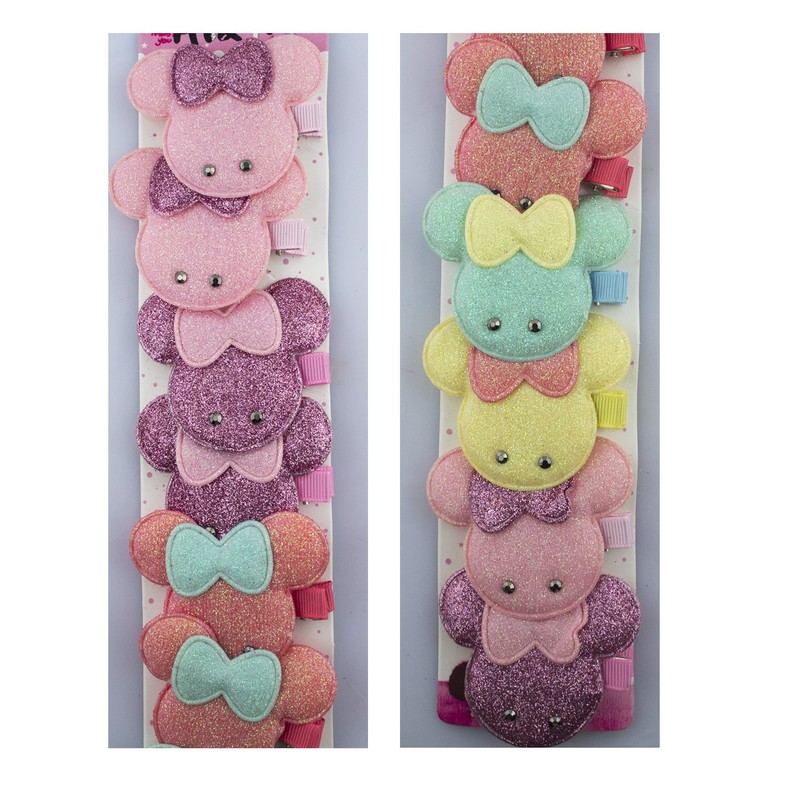 - A pair of colourful glittery padded hair clip barrettes, in a cute minnie mouse design.