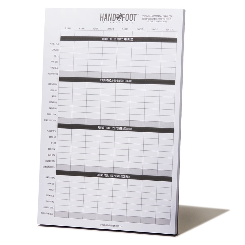 Our Hand & Foot Remastered Scorepads are printed double-sided on 60 sheets of high-quality paper and, at 7 X 10.5 inches, allow for up to 8 players with large blocks to write in.