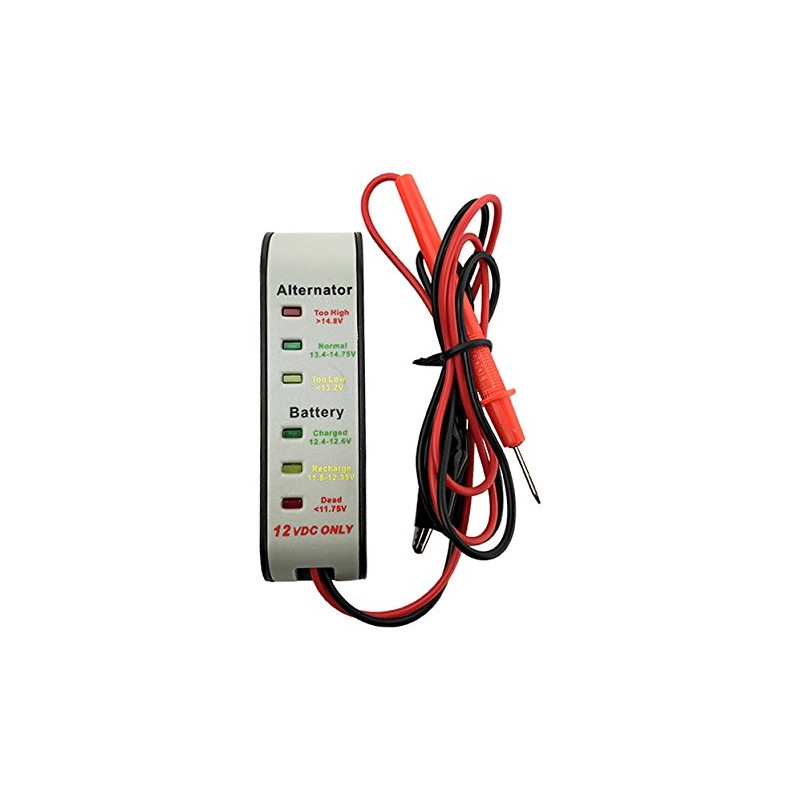 - Battery Testing: A. With engine off, touch the positive battery post with the red probe & the negative post with the black clamp. B. The LED indicator will show battery condition. Alternator Testing: A. With engine running, touch the positive battery post with the red probe & the negative post with the black clamp. B. The LED indicator will display the alternator output.