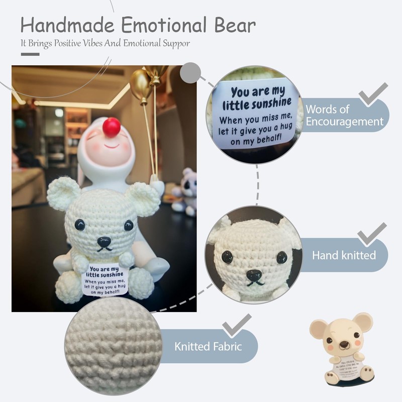 Hand Knitted Bear Plush Toy with Inspirational Cards - Soft Crochet Stuffed Animal for Anxiety Relief, Cute Desk Decor Gift for Adults (Style A)