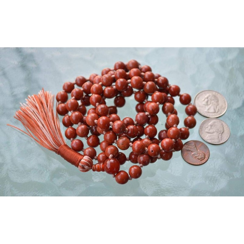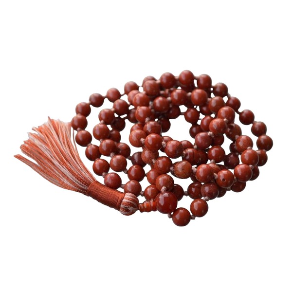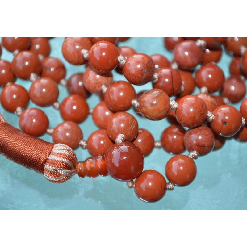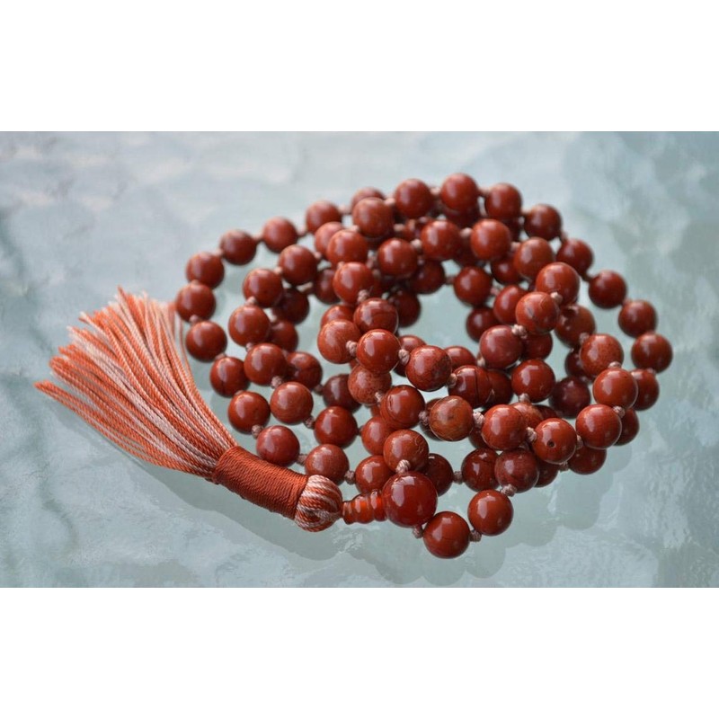 - Artisan Craftsmanship: Each bead is meticulously hand-knotted, ensuring durability and a smooth flow during your meditation practice. The vibrant red hue of the Jasper beads adds a touch of elegance and power to this mala. Versatile Use: Perfect for meditation, prayer, or as a daily accessory, this mala supports mantra chanting and mindfulness practices. The 108 beads symbolize wholeness and spiritual completeness, enhancing your spiritual rituals.