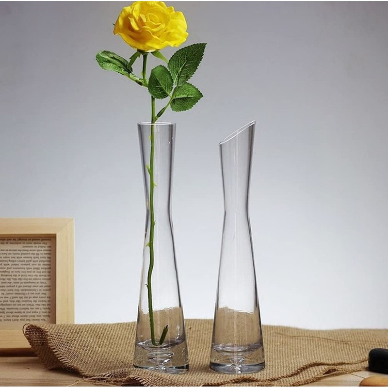 Hand-Made Blown Art Bud Glass Vase Clear Small Glass Vase Glass Flower Vase Heavy Base Single Stem Flower Drop Vase for Flower and Office Bud Home Wedding Decor (25cm-Oblique Mouth)
