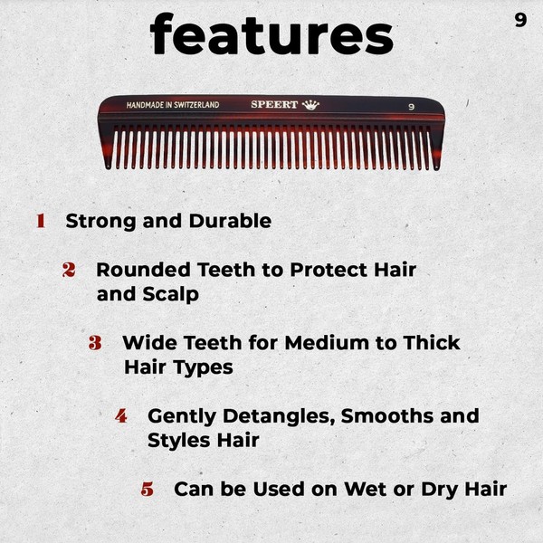 Speert #9 Handmade Wide Tooth Comb Tortoise Havana Acetate Thick Coarse Curly Detangling Parting Grooming Teasing Hair Styling Hairdresser Barber Hairdressing Wet Dry Pocket Travel Women Men Kids