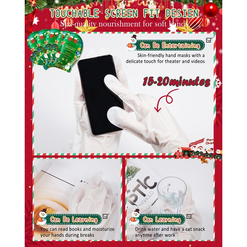 Hand mask is a product specially designed for hand care which deeply nourishes the hand skin, improves dryness and roughness and restores softness and shine to the hand skin. Regular use of hand masks combined with daily hand care can improve the condition of hand skin more effectively. This Christmas-themed hand mask is perfect for personal use or as a gift for Christmas Thanksgiving.