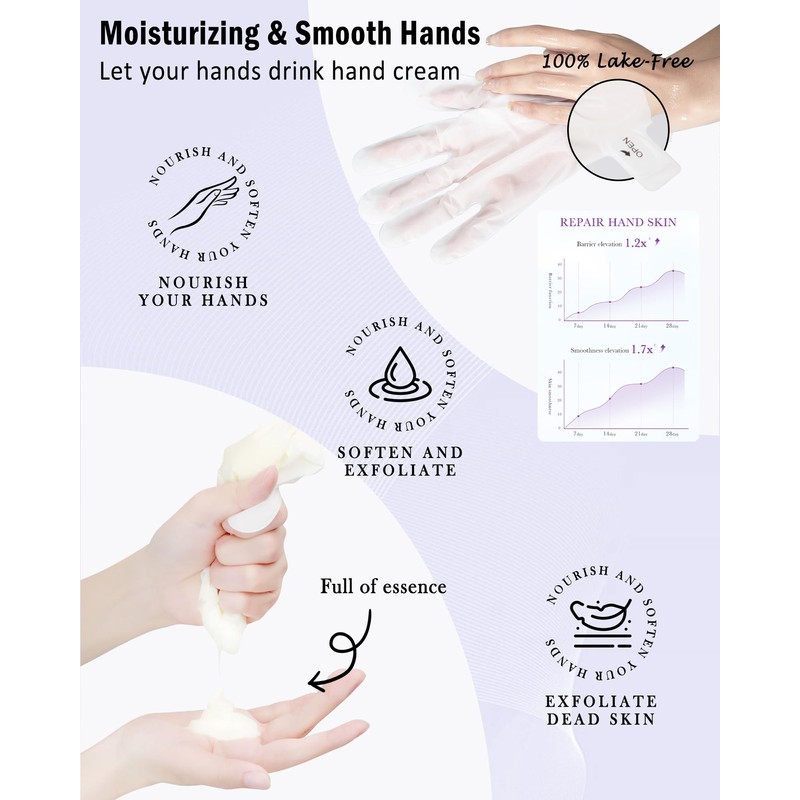 • Moisturizing Hand Mask - This hand mask contains glycerin, urea, niacinamide, goat's milk and other ingredients, free of fragrances and irritants, suitable for all skin types. These ingredients can deeply nourish the skin of the hands, strengthen the skin barrier nutrients, help to exfoliate the aging of the hands, to achieve a strong hydration and moisturizing effect, so that the skin is smoother and more delicate.