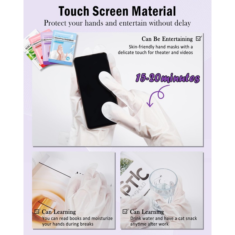 • Touch Screen Material-: The hand mask is made of touchable screen material, even during the process of enjoying hand beauty treatment, you can still operate electronic products, do housework, etc. without any restriction. And it is a disposable product, easy to carry and use.